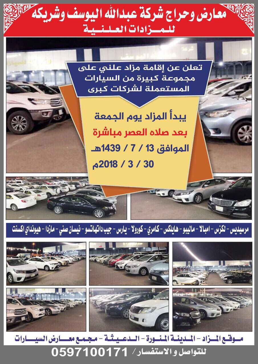 قـريـبـا فـي الـمـديـنـة twitter પર تعلن شركة معارض وحراج عبدالله اليوسف وشريكه للسيارات عن إقامة مزاد علني على مجموعة من السيارات رجيع شركات كبرى من نوع يارس تويوتا ونوع هونداي اكسنت